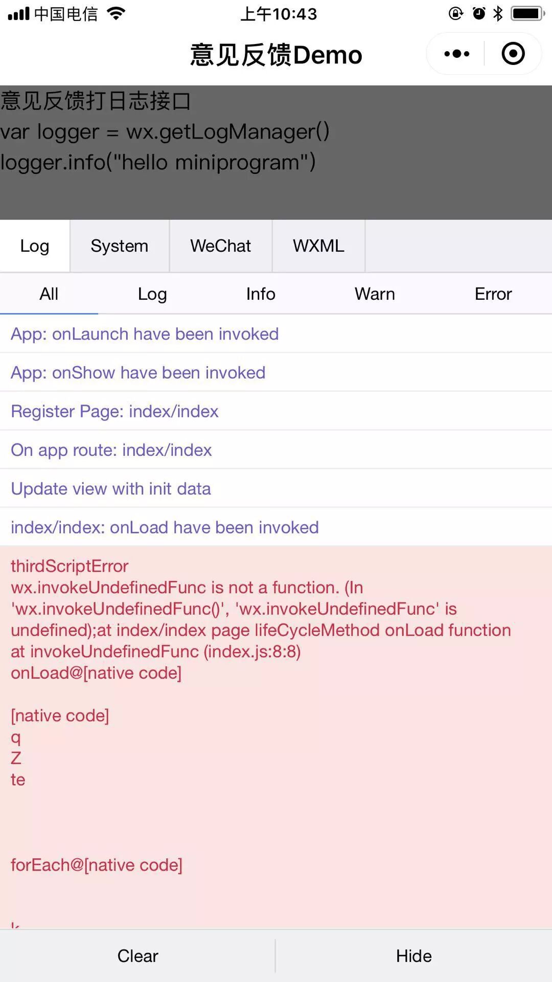 除了异常日志,开发者还可以通过 console.log 接口在一些关键执行路径上打日志来定位问题,这些日志会呈现在 Log 面板上。